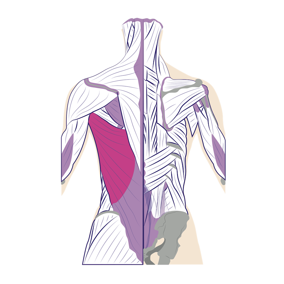 The latissimus dorsi, often called the lats, are large, wing-shaped muscles that extend from the upper to the lower back. They help move the arms and shoulders.